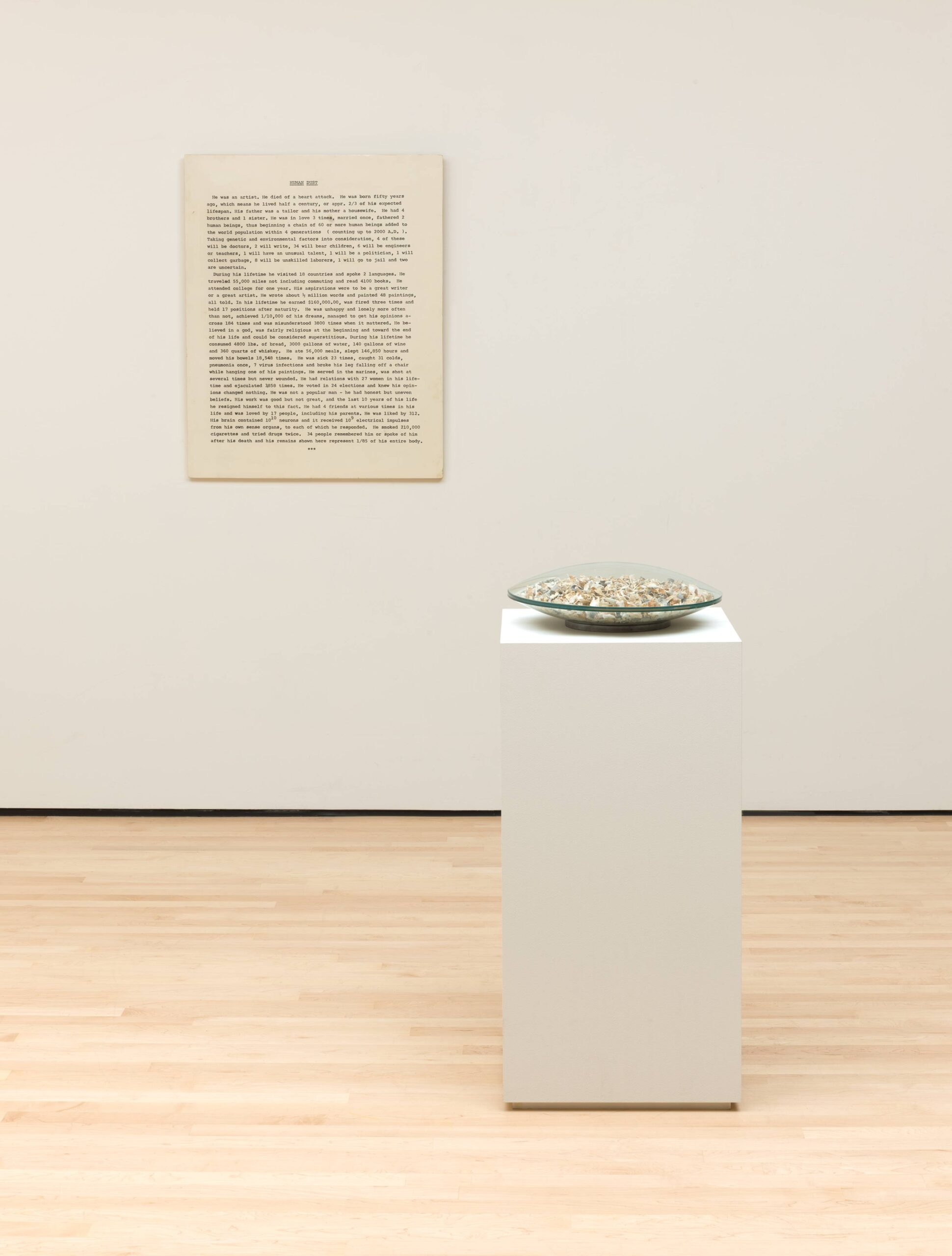To παραπάνω έργο τέχνης που ως installation (εικαστική εγκατάσταση) αποτελείται από το κείμενο που διαβάσατε μεταφρασμένο μαζί με αυτό το δοχείο με ανθρώπινα λείψανα, δημιουργήθηκε από την Agnes Denes το 1969 και εκτίθεται σήμερα στο μουσείο Μοντέρνας Τέχνης του Σαν Φρανσίσκο.